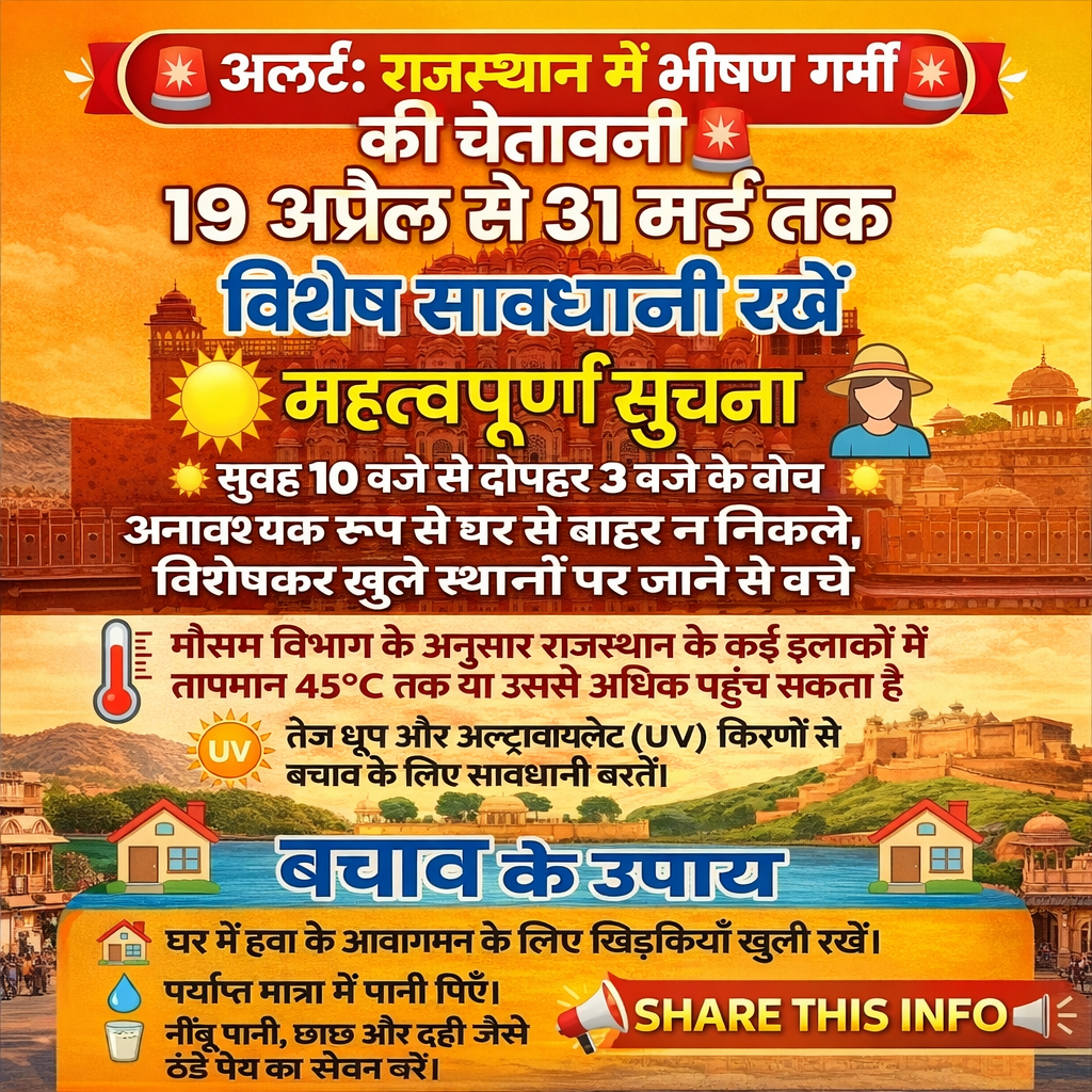 рд░рд╛рдЬрд╕реНрдерд╛рди рдореЗрдВ рдЖрдиреЗ рд╡рд╛рд▓реЗ рджрд┐рдиреЛрдВ рдореЗрдВ рднреАрд╖рдг рдЧрд░реНрдореА рдХрд╛ рдЕрд╕рд░ рджреЗрдЦрдиреЗ рдХреЛ рдорд┐рд▓реЗрдЧрд╛ред рдореМрд╕рдо рд╡рд┐рднрд╛рдЧ рдХреЗ рдЕрдиреБрд╕рд╛рд░ 19 рдЕрдкреНрд░реИрд▓ рд╕реЗ 31 рдордИ рддрдХ рд░рд╛рдЬреНрдп рдХреЗ рдХрдИ рдЬрд┐рд▓реЛрдВ рдореЗрдВ рддрд╛рдкрдорд╛рди 45┬░C рдпрд╛ рдЙрд╕рд╕реЗ рдЕрдзрд┐рдХ рддрдХ рдкрд╣реБрдВрдЪ рд╕рдХрддрд╛ рд╣реИред рдРрд╕реЗ рдореЗрдВ рд╕рднреА рд▓реЛрдЧреЛрдВ рдХреЛ рд╡рд┐рд╢реЗрд╖ рд╕рд╛рд╡рдзрд╛рдиреА рдмрд░рддрдиреЗ рдХреА рдЬрд░реВрд░рдд рд╣реИ, рдЦрд╛рд╕рдХрд░ рдмрдЪреНрдЪреЛрдВ, рдмреБрдЬреБрд░реНрдЧреЛрдВ рдФрд░ рдмреАрдорд╛рд░ рд╡реНрдпрдХреНрддрд┐рдпреЛрдВ рдХреЛред